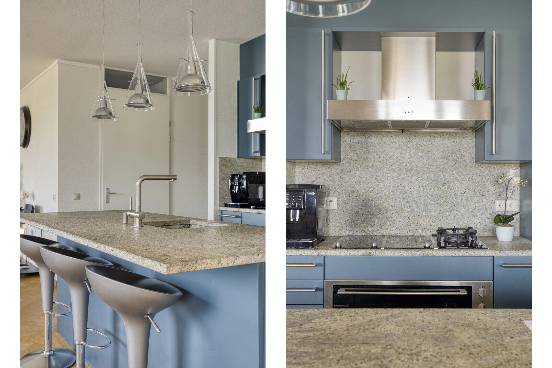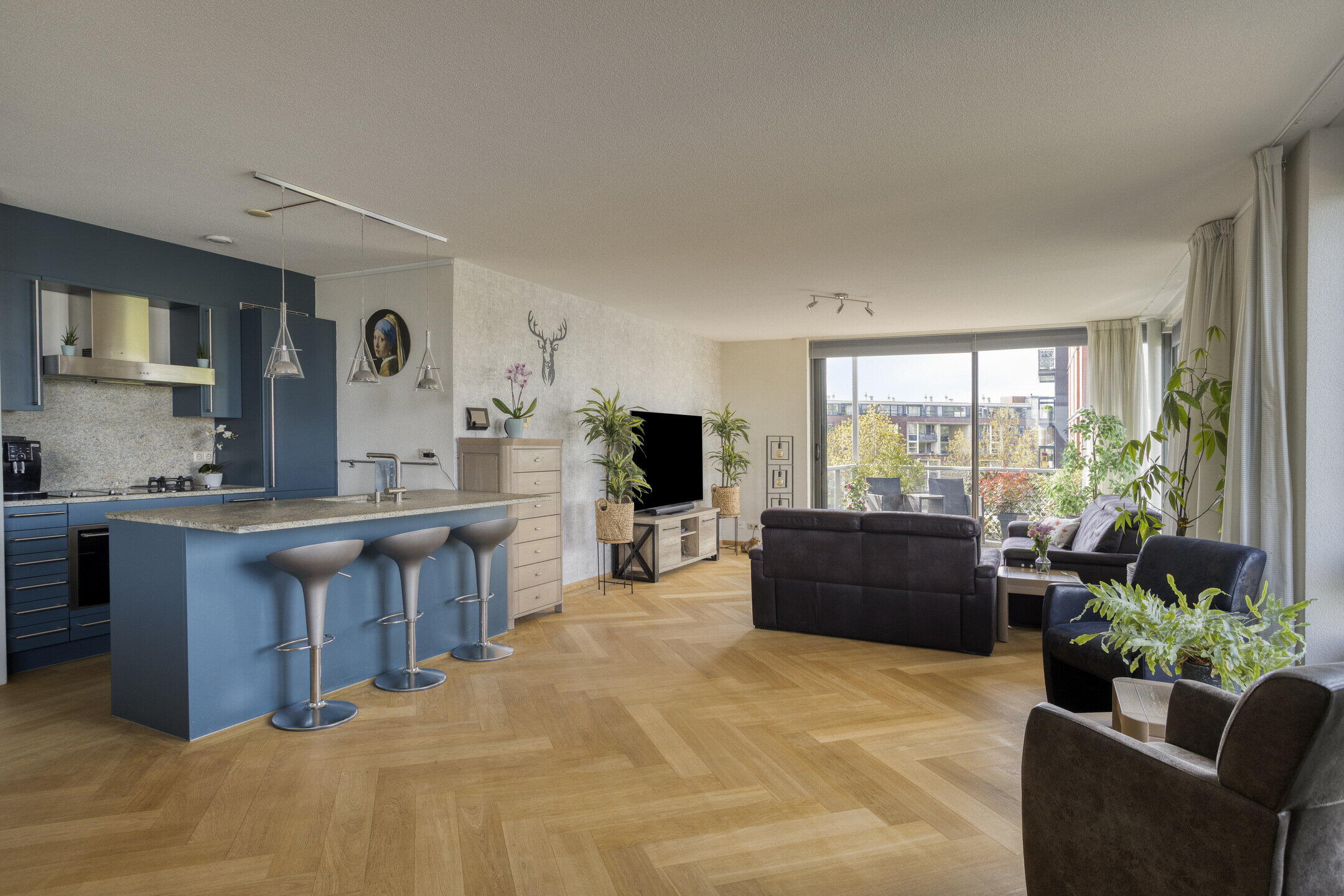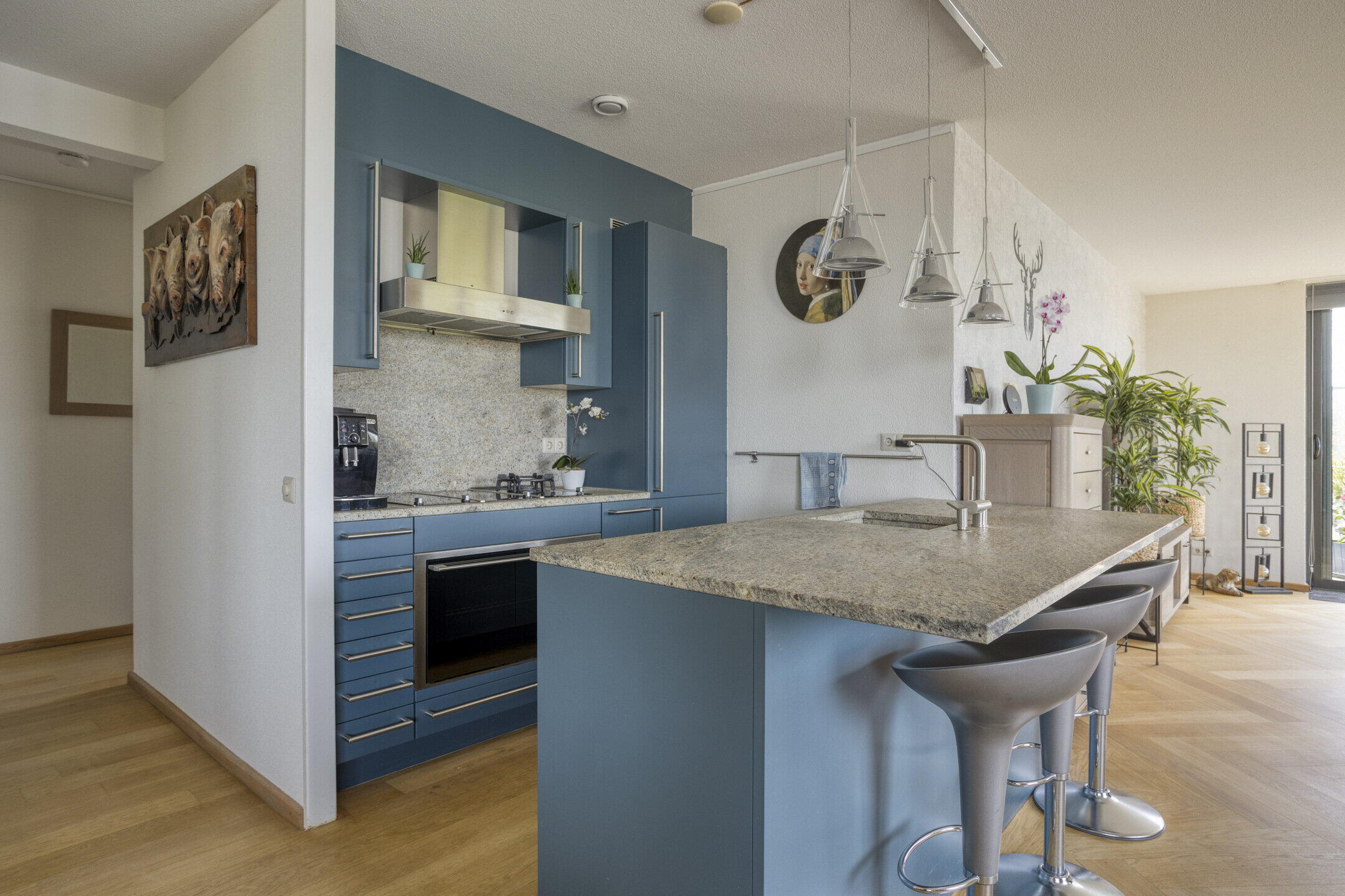 De open keuken vormt het hart van de woning. De blauwe kleurstelling maakt het een echte eyecatcher en met het gezellige barretje is het dé plek om samen te komen terwijl er gekookt wordt.