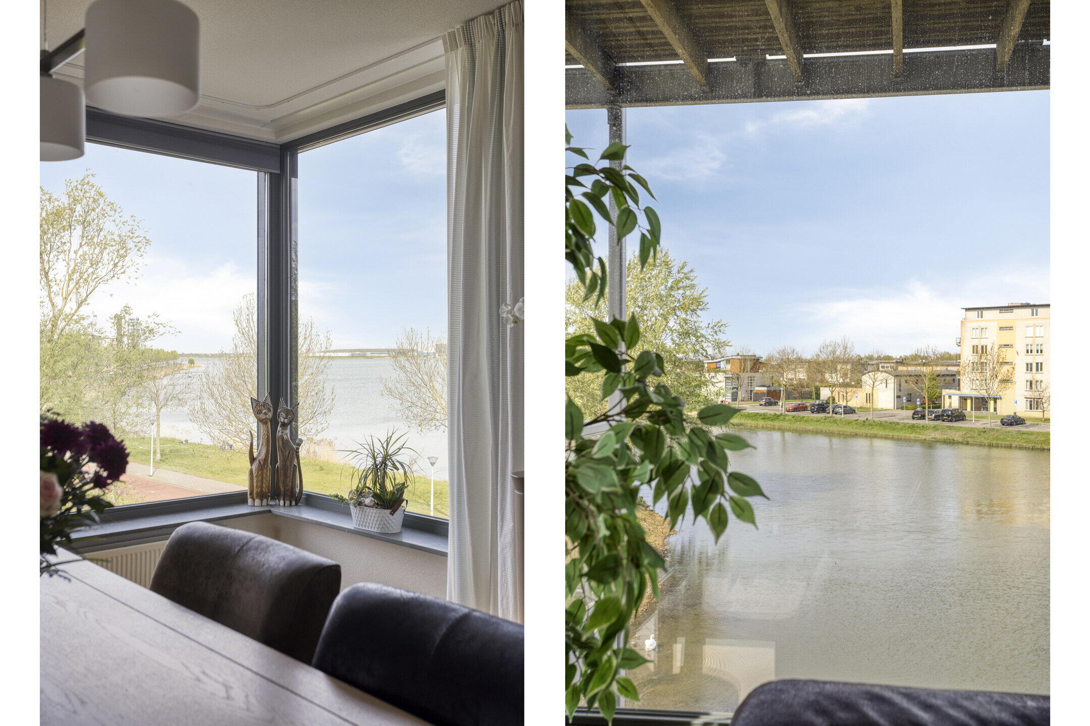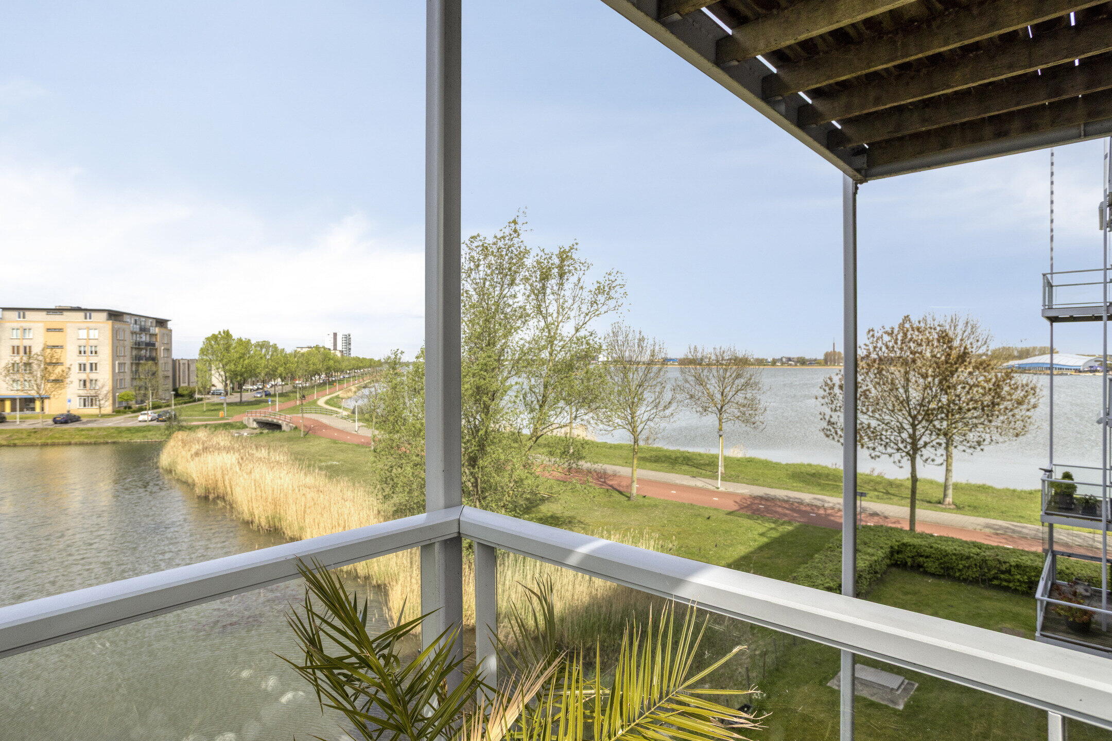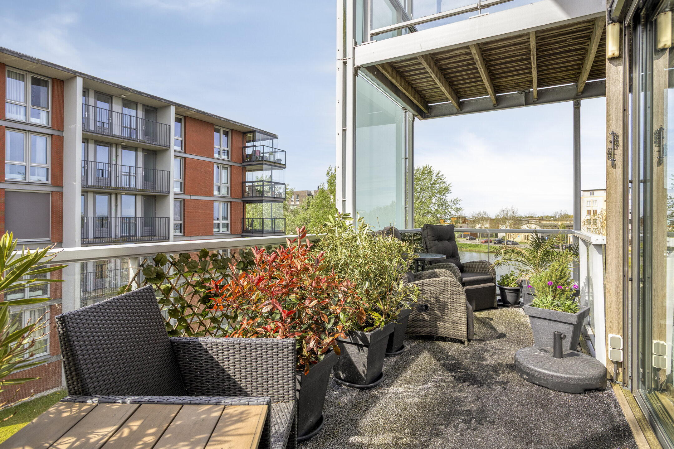 Vanuit de woonkamer stap je zo het balkon op. Hier creëer je eenvoudig een fijne zitplek waar je in alle rust kunt genieten van het uitzicht op groen en water. Een heerlijke plek om even te ontsnappen aan de drukte van de dag.