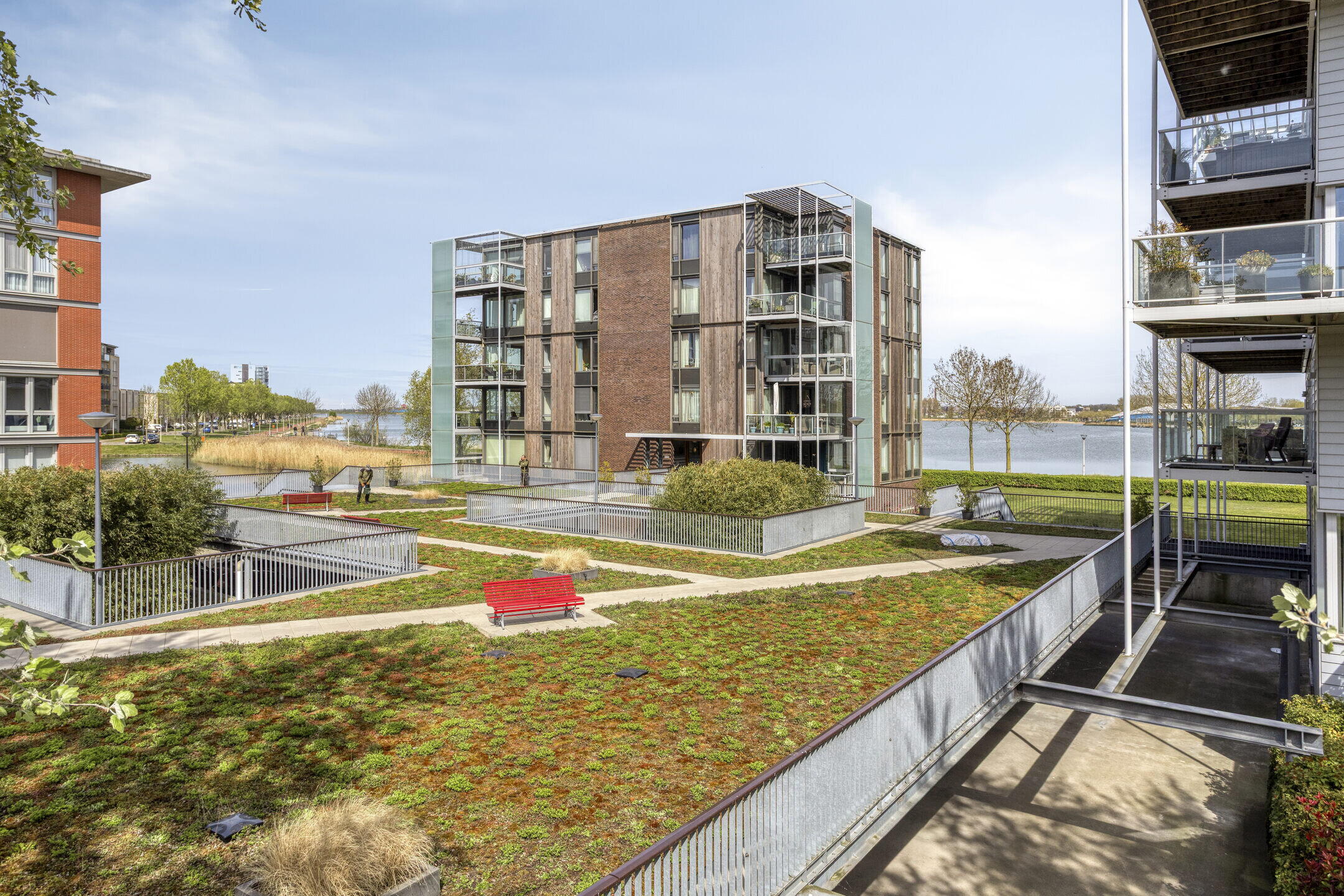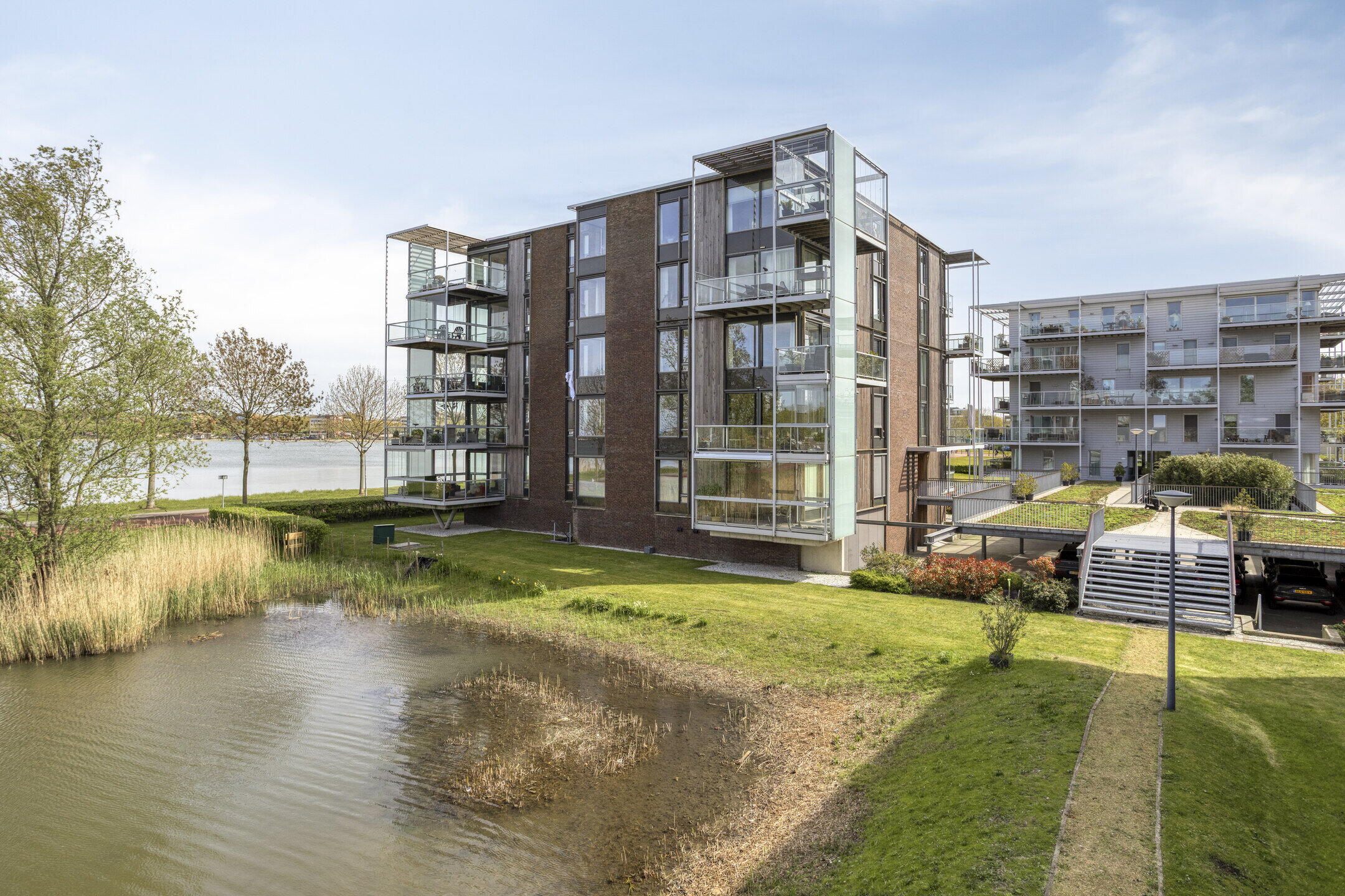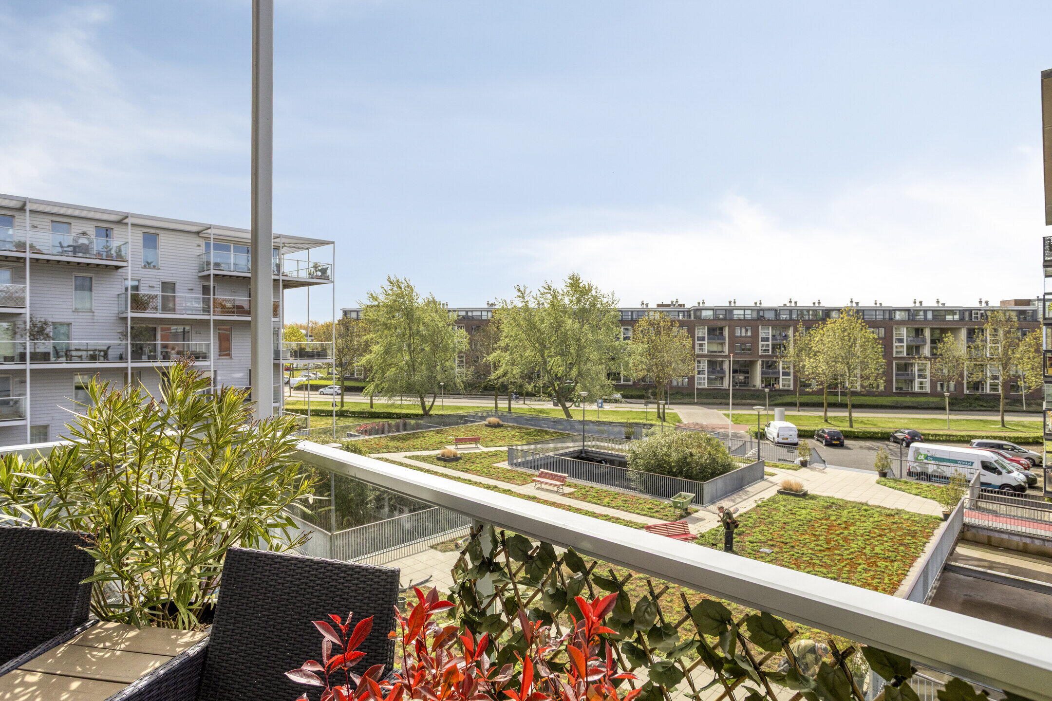 Vanuit de woonkamer stap je zo het balkon op. Hier creëer je eenvoudig een fijne zitplek waar je in alle rust kunt genieten van het uitzicht op groen en water. Een heerlijke plek om even te ontsnappen aan de drukte van de dag.