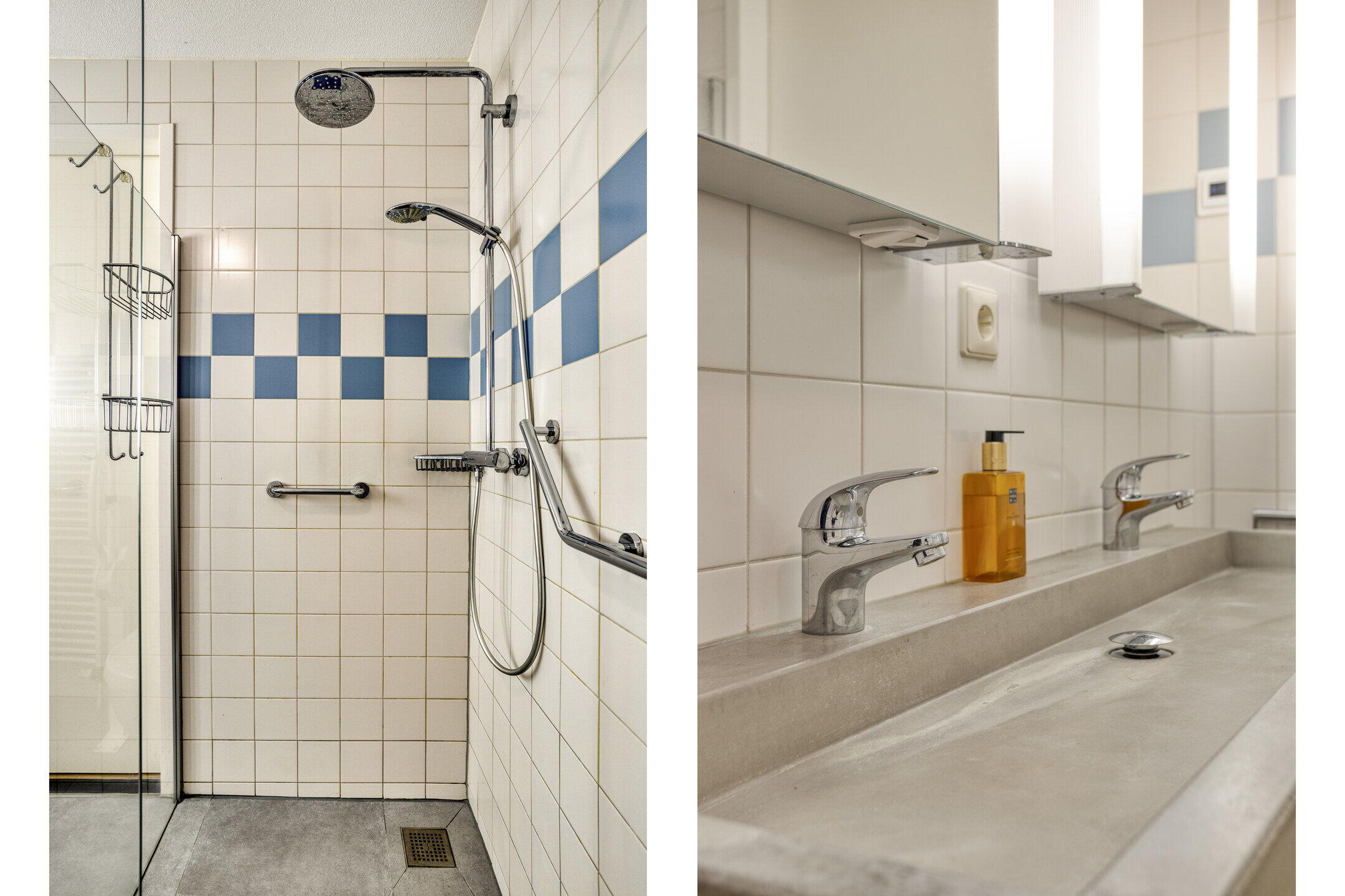 - Toilet, douche, dubbele wastafel, wastafelmeubel