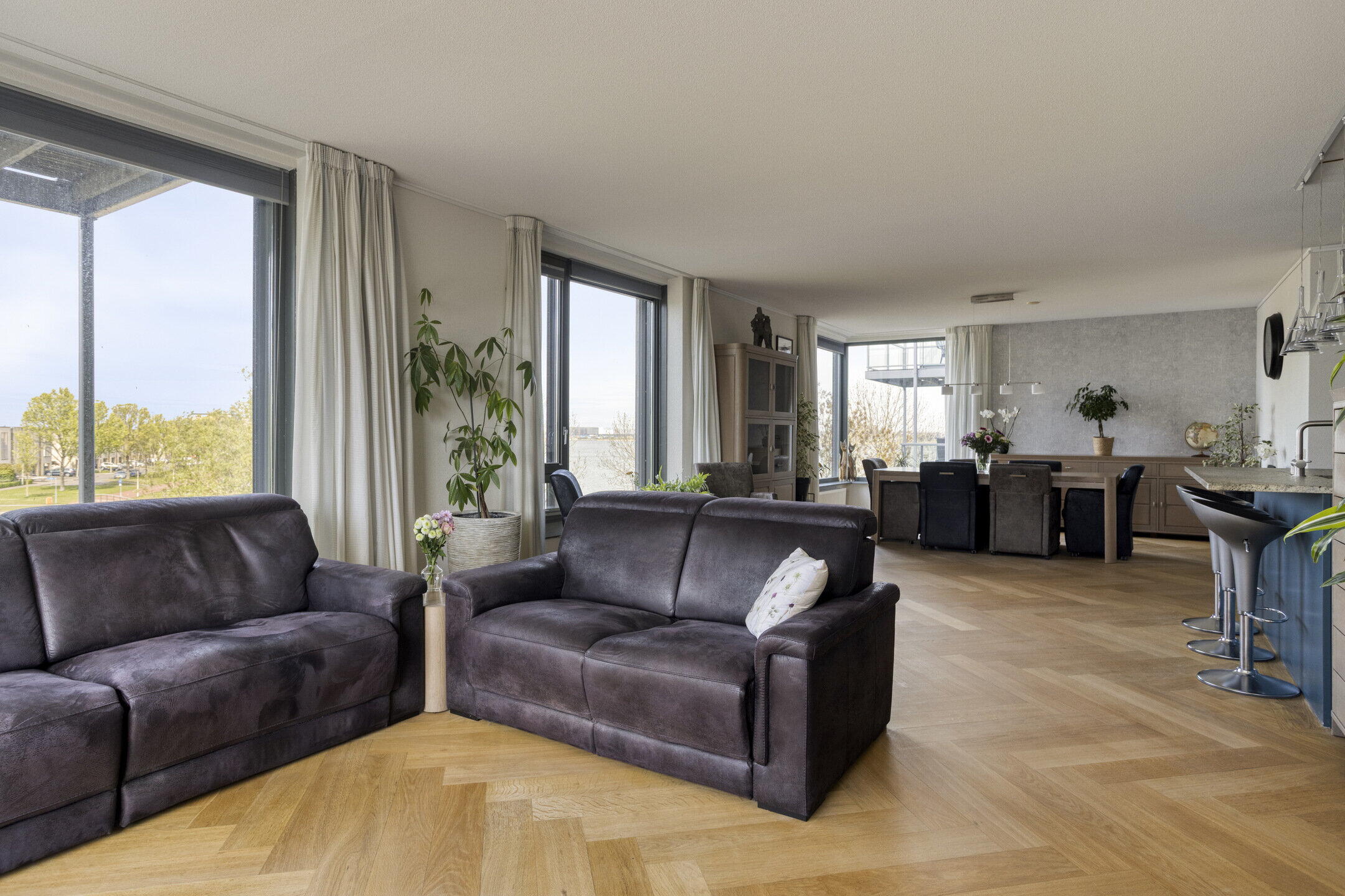 Zodra je de leefruimte binnenstapt, valt het meteen op: licht, ruimte en een prachtig uitzicht. De stijlvolle visgraatvloer en de grote raampartijen aan meerdere zijdes zorgen voor een warme, maar tegelijkertijd frisse uitstraling. Het vrije zicht op groen en water brengt rust in huis en maakt dit echt een fijne plek om thuis te komen.